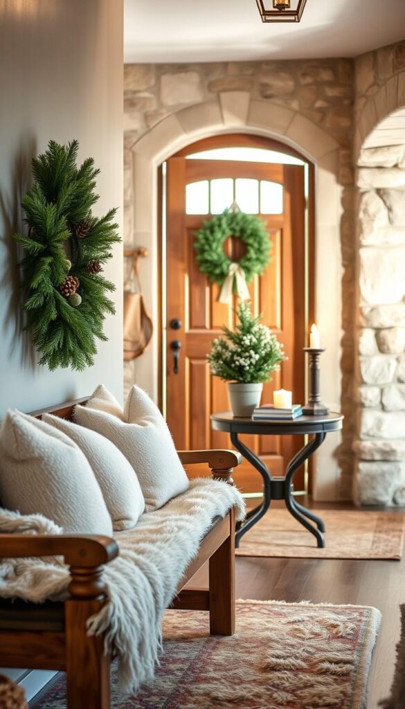 Lighting matters too! A small lantern or string lights near the door brighten the space and extend the holiday glow past December. Mix practicality with charm—your entryway will feel cozy in no time.